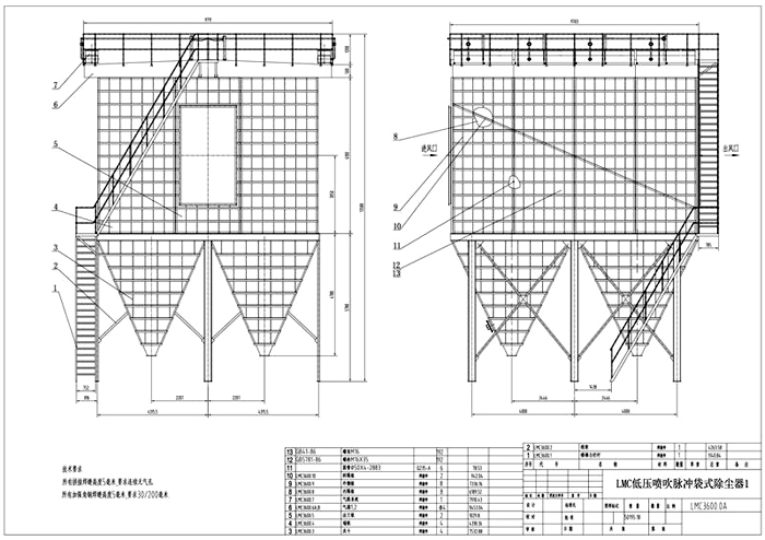 (1)鑄造廠電爐布袋除塵器 結(jié)構(gòu) 點 除塵器中部箱體為園形筒狀結(jié)構(gòu),設(shè)計壓力0.25MPa,材質(zhì)為Q345R,板厚14mm以上。其上設(shè): 檢修人孔。 箱體設(shè)氮氣吹掃系統(tǒng),用于qingchu積聚的灰塵和筒體煤氣置換吹掃; 高爐布袋除塵器 高爐布袋除塵器(2張) 儀表壓縮空氣系統(tǒng),用于閥門控制;設(shè)人工灰塵檢測口,方便取樣化驗。 懸掛式箱體支座。煤氣進口接管設(shè)相應(yīng)導(dǎo)流配氣裝置。 高爐布袋除塵器頂部采用符合/T4746-2002標準要求的正橢圓形封頭,壁厚16mm以上,材質(zhì)Q345R。凈煤氣從箱體頂部接出,在封頭上設(shè)有anquan閥及放散管。 高爐布袋除塵器下部采用錐形灰斗,材質(zhì)Q345R,板厚14mm以上,錐形灰斗錐角為50°,確保灰塵順利排出。下錐體上設(shè)雙路蒸汽保溫盤管防止煤氣結(jié)露和粉塵結(jié)塊而影響排灰。灰斗上下高低灰位各設(shè)一個熱電阻檢測灰斗的灰位,并設(shè)有倉壁震動器兩套和氮氣吹掃管。 除塵器進、出口管道分別設(shè)置全封閉式電動插板閥、氣動三偏心蝶閥、大拉桿波紋補償器、手孔。